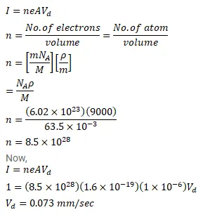 A current of $1.0$ A exists in a copper wire of cross-section $1.0 \mathrm{~mm}^{2}$. Assuming one free electron per atom calculate the drift speed of the free electrons in the wire. The density of copper is $9000 \mathrm{~kg} / \mathrm{m}^{3}$.