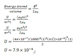 A current of $1.0 \mathrm{~A}$ is established in a tightly wound solenoid of radius $2 \mathrm{~cm}$ having 1000 turns/meter. Find the magnetic energy stored in each meter of the solenoid.