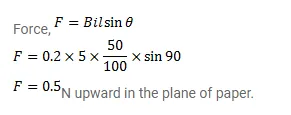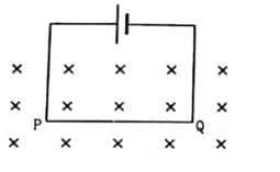 A current of $5.0 \mathrm{~A}$ exists in the circuit shown in figure. The wire $P Q$ has a length of $50 \mathrm{~cm}$ and the magnetic field in which it is immersed has a magnitude of $0.20 \mathrm{~T}$. Find the magnetic force acting on the wire $\mathrm{PQ}$.