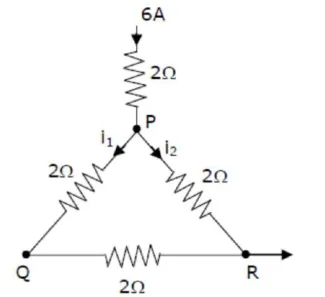 A current of $6 \mathrm{~A}$ enters one corner $\mathrm{P}$ of an equilateral triangle $\mathrm{PQR}$ having 3 wires of resistance $2 \Omega$ each and leaves by the corner $R$. The currents $i_{1}$ in ampere is