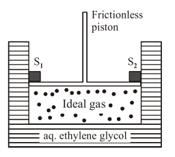 A cylinder containing an ideal gas $(0.1$ mol of $1.0 \mathrm{dm}^{3}$ ) is in thermal equilibrium with a large volume of $0.5$ molal aqueous solution of ethylene glycol at its freezing point. If the stoppers $S_{1}$ and $S_{2}$ (as shown in the figure) are suddenly withdrawn, the volume of the gas in litres after equilibrium is achieved will be