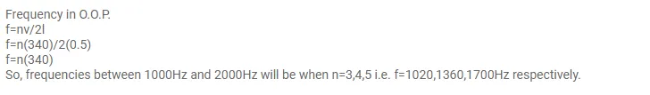A cylindrical metal tube has a length of $50 \mathrm{~cm}$ and is open at both ends. Find the frequencies between $1000 \mathrm{~Hz}$ and $2000 \mathrm{~Hz}$ at which the air column in the tube can resonate. Speed of sound in air is $340 \mathrm{~m} \mathrm{~s}^{-1}$.