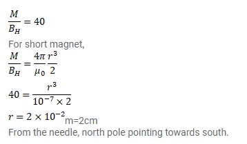 A deflection magnetometer is placed with its arms in north-south direction. How and where should a short magnet having $\frac{M}{B_{H}}=40 \mathrm{~A}-\mathrm{m}^{2} / T$ be placed so that the needle can stay in any position?