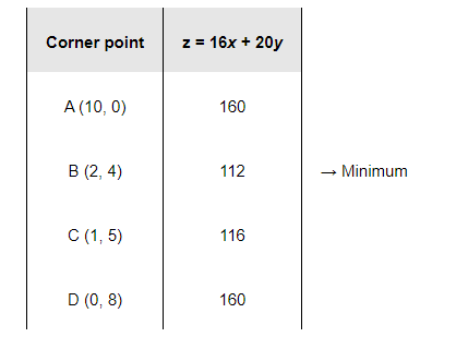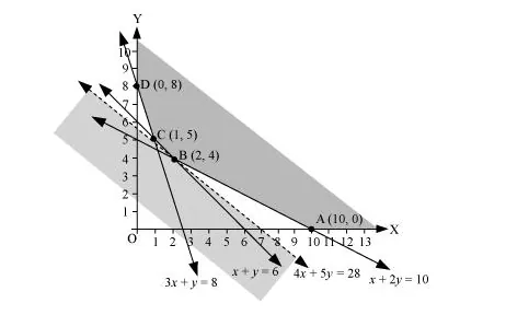 The corner points of the feasible region are A (10, 0), B (2, 4), C (1, 5), and D (0, 8).