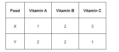 A dietician wishes to mix together two kinds of food X and Y in such a way that the mixture contains at least 10 units of vitamin A, 12 units of vitamin B and 8 units of vitamin C. The vitamin content of one kg food is given below: