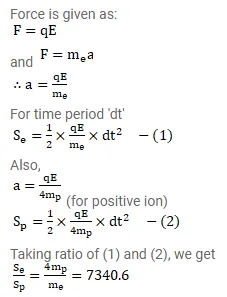 A discharge tube contains helium at a low pressure. A large potential difference is applied across the tube. Consider a helium atom that has just been ionized due to the detachment of an atomic electron. Find the ratio of the distance travelled by the free electron to that by the free electron to that by the positive ion in a short time dt after the ionization.