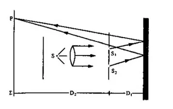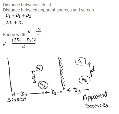 A double slit $\mathrm{S}_{1}-\mathrm{S}_{2}$ is illuminated by a coherent light of wavelength $\lambda$. The slits are separated by a distance $\mathrm{d}$. A plane mirror is placed in front of the double slit at a distance $D_{1}$ from it and a screen $\Sigma$ is placed behind the double slit at a distance $D_{2}$ from it. The screen $\Sigma$ receives only the light reflected by the mirror. Find the fringe-width of the interference pattern on the screen.
