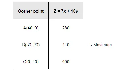The corner points are A (40, 0), B (30, 20), and C (0, 40).