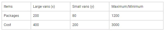 A firm has to transport 1200 packages using large vans which can carry 200 packages each and small vans which can take 80 packages each. The cost for engaging each large van is Rs 400 and each small van is Rs 200. Not more than Rs 3000 is to be spent on the job and the number of large vans cannot exceed the number of small vans. Formulate this problem as a LPP given that