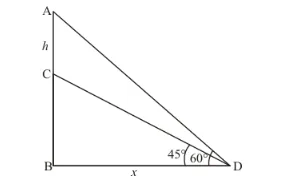 Let, $A C=h \mathrm{~m}$ and $B C=5 \mathrm{~m}$ and $\angle A D B=60^{\circ}, \angle C D B=45^{\circ}$