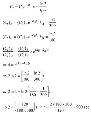 A flask contains a mixture of compounds A and B. Both compounds decompose by first-order kinetics. The halflives for $\mathrm{A}$ and $\mathrm{B}$ are $300 \mathrm{~s}$ and $180 \mathrm{~s}$, respectively. If the concentrations of $A$ and $B$ are equal initially, the time required for the concentration of $A$ to be four times that of $\mathrm{B}$ (in $\mathrm{s}$ ) is: (Use $\ln 2=0.693$ )