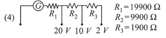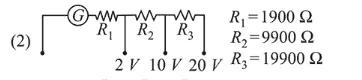 A galvanometer of resistance $100 \Omega$ has 50 divisions on its scale and has sensitivity of $20 \mu \mathrm{A} /$ division. It is to be converted to a voltmeter with three ranges, of $0-2 \mathrm{~V}$, $0-10 \mathrm{~V}$ and $0-20 \mathrm{~V}$. The appropriate circuit to do so is :