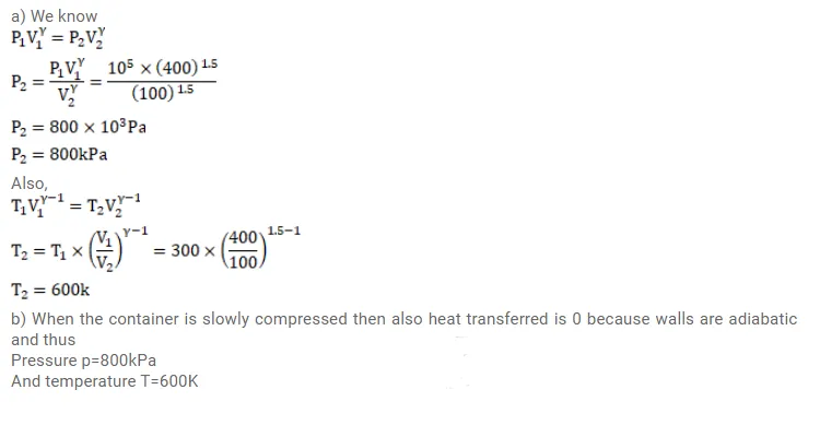 A gas is enclosed in a cylindrical can fitted with a piston. The walls of the can and the piston are adiabatic. The initial pressure, volume and temperature of the gas are $100 \mathrm{kPa}, 400 \mathrm{~cm}^{3}$ and $300 \mathrm{~K}$ respectively. The ratio of the specific heat capacities of the gas is $C_{p} / C_{v}=1.5$.