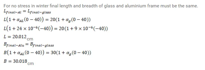 A glass window is to be fit in an aluminium frame. The temperature on the working day is $40{ }^{\circ} \mathrm{C}$ and the glass window measures exactly $20 \mathrm{~cm} \times 30 \mathrm{~cm}$. What should be the size of the aluminium frame so that there is no stress on the glass in winter even if the temperature drops to $0^{\circ} \mathrm{C}$ ? Coefficients of linear