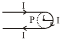 $\mathrm{B}=2 \times \frac{\mu_{0} \mathrm{i}}{4 \pi \mathrm{r}}+\frac{\mu_{0} \mathrm{i}}{2 \mathrm{r}}\left(\frac{\pi}{2 \pi}\right)$