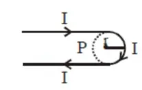 A hairpin like shape as shown in figure is made by bending a long current carrying wire. What is the magnitude of a magnetic field at point $\mathrm{P}$ which lies on the centre of the semicircle?