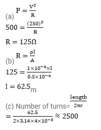A heater-coil is to be constructed with a nichrome wire $\left(\rho=1.0 \times 10^{-6} \Omega-\mathrm{m}\right)$ which can operate at $500 \mathrm{~W}$ when connected to a $250 \mathrm{~V}$ supply. (a) What would be the resistance of the coil? (b) If the cross-sectional area of the wire is $0.5 \mathrm{~mm}{ }^{2}$, what length of the wire will be needed? (c) If the radius of each turn is $4.0 \mathrm{~mm}$, how many turns will be there in the coil?