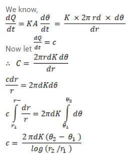 A hole of radius $r_{1}$ is made centrally in a uniform circular disc of thickness $d$ and radius $r_{2}$. The inner surface (a cylinder of length $d$ and radius $r_{1}$ ) is maintained at a temperature $\theta_{1}$ and the outer surface (a cylinder of length $d$ and radius $\left.r_{2}\right)$ is maintained at a temperature $\theta_{2}\left(\theta_{1}>\theta_{2}\right)$. The thermal conductivity of the material of the disc is $\mathrm{K}$. Calculate the heat flowing per unit time through the disc.