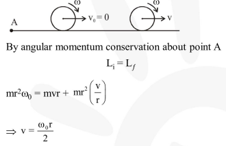A hoop of radius $\mathrm{r}$ and mass $m$ rotating with an angular velocity $\omega_{0}$ is placed on a rough horizontal surface. The initial velocity of the centre of the hoop is zero. What will be the velocity of the centre of the hoop when it ceases to slip ?