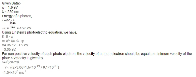 A horizontal cesium plate $(\varphi=1.9 \mathrm{eV})$ is moved vertically downward at a constant speed $v$ in a room full of radiation of wavelength $250 \mathrm{~nm}$ and above. What should be the minimum value of $v$ so that the vertically-upward component of velocity is non-positive for each photoelectron?
