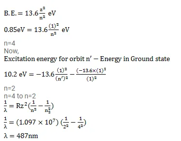 A hydrogen atom in a state having a binding energy of $0.85 \mathrm{eV}$ makes transition to a state with excitation energy $10.2 \mathrm{eV}$. Identify the quantum numbers $n$ of the upper and the lower energy states involved in the transition. Find the wavelength of the emitted radiation.