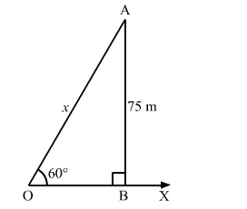 $\Rightarrow x=\frac{75 \times 2}{\sqrt{3}}=\frac{150}{1.732}=86.6 \mathrm{~m}$