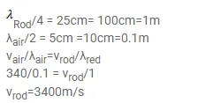 A Kundt's tube apparatus has a copper rod of length $1.0 \mathrm{~m}$ clamped at $25 \mathrm{~cm}$ from one of the ends. The tube contains air in which the speed of sound is $340 \mathrm{~m} \mathrm{~s}^{-1}$. The powder collects in heaps separated by a distance of $5.0 \mathrm{~cm}$. Find the speed of sound waves in copper.