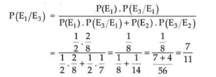 P(E1) = ½, P(E2) = ½, P(E3/E1) = 2/8 and P(E3/E2) = 1/7