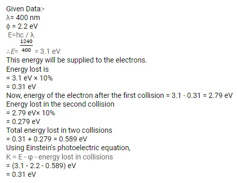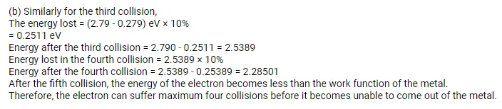 (a) A particular electron absorbs a photon and makes two collisions before coming out of the metal. Assuming that $10 \%$ of the extra energy is lost to the metal in each collision, find the kinetic energy of this electron as it comes out of the metal.