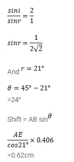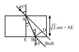 Question: A light ray is incident at an angle of $45^{\circ}$ with the normal to $\mathrm{a} \sqrt{2} \mathrm{~cm}$ thick plate (refractive index $=2$ ). Find the shift in the path of the light as it emerges out from the plate.
