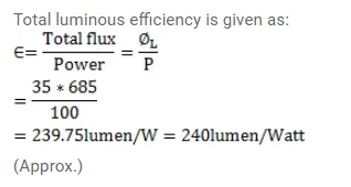 A light source emits monochromatic light of wavelength $55 \mathrm{~nm}$. The source consume $100 \mathrm{~W}$ of electric power and emits $35 \mathrm{~W}$ of radiant flux. Calculate the overall luminous efficiency.