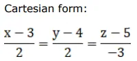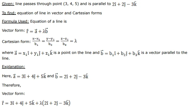 A line passes through the point $(3,4,5)$ and is parallel to the vector $(2 \hat{\mathrm{i}}+2 \hat{\mathrm{j}}-3 \hat{\mathrm{k}})$. Find the equations of the line in the vector as well as Cartesian forms.