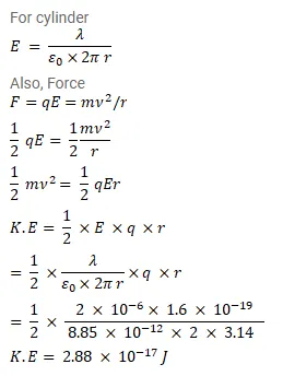 A long cylindrical wire carries a positive charge of linear density $2.0 \times 10^{-8} \mathrm{C} / \mathrm{m}$. An electron revolves around it in a circular path under the influence of the attractive electrostatic force. Find the kinetic energy of the electron. Note that is independent of the radius.