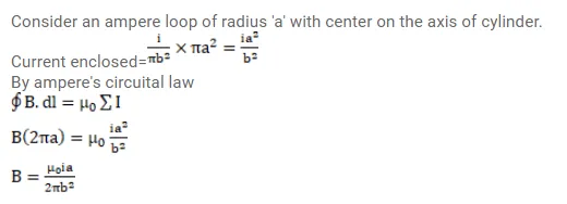 A long, cylindrical wire of radius b carries a current i distributed over its cross-section. Find the magnitude of the magnetic field at a point inside the wire at a distance a from the axis.