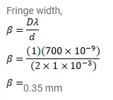 A long narrow horizontal slit is placed $1 \mathrm{~mm}$ above a horizontal plane mirror. The interference between the light coming directly from the slit and that after reflection is seen on a screen $1.0 \mathrm{~m}$ away from the slit. Find the fringe-width if the light used has a wavelength of $700 \mathrm{~nm}$.