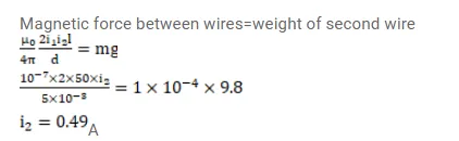 A long, straight wire is fixed horizontally and carries a current of $50.0 \mathrm{~A}$. A second wire having linear mass density $1.0 \times 10^{-4} \mathrm{~kg} / \mathrm{m}$ is placed parallel to and directly above this wire at a separation of $5.0 \mathrm{~mm}$. What current should this second wire carry such that the magnetic repulsion can balance its weight?