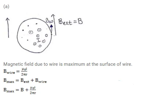A long, straight wire of radius $r$ carries a current $i$ and placed horizontally in a uniform magnetic field B pointing vertically upward. The current is uniformly distributed over its cross-section.