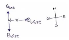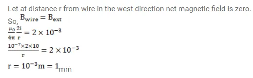 A long, vertical wire carrying a current of $10 \mathrm{~A}$ in the upward direction is placed in a region where a horizontal magnetic field of magnitude $2.0 \times 10^{-3} \mathrm{~T}$ exists from south to north. Find the point where the resultant magnetic field is zero.