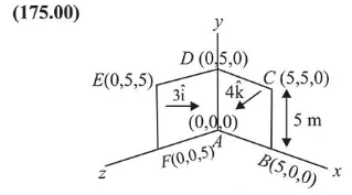 A loop ABCDEFA of straight edges has six corner points $A(0,0,0), B\{5,0,0), C(5,5,0), D(0,5,0), E(0,5,5)$ and $F(0,0,5)$. The magnetic field in this region is $\vec{B}=(3 \hat{i}+4 \hat{k}) \mathrm{T}$. The quantity of flux through the loop $A B C D E F A$ (in $\mathrm{Wb}$ ) is_______