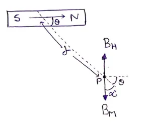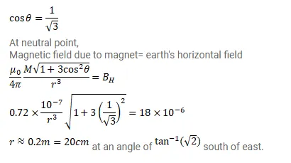 A magnetic dipole of magnetic moment $0.72^{\sqrt{2}} \mathrm{~A}-\mathrm{m}^{2}$ is placed horizontally with the north pole pointing towards east. Find the position of the neutral point if the horizontal component of the earth's magnetic field is $18 \mu T$.