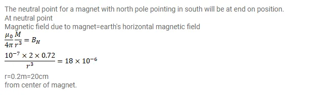 A magnetic dipole of magnetic moment $0.72 \mathrm{~A}-\mathrm{m}^{2}$ is placed horizontally with the north pole pointing towards south. Find the position of the neutral point if the horizontal component of the earth's magnetic field is $18 \mu \mathrm{T}$.