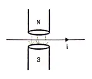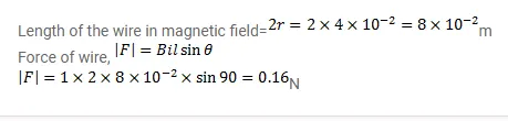 A magnetic field of strength $1.0 \mathrm{~T}$ is produced by a strong electromagnet in a cylindrical region of radius $4.0 \mathrm{~cm}$ as shown in figure. A wire, carrying a current of $2.0 \mathrm{~A}$, is placed perpendicular to and intersecting the axis of the cylindrical region. Find the magnitude of the force acting on the wire.