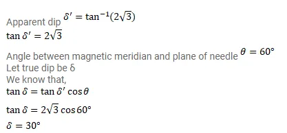 A magnetic needle is free to rotate in a vertical plane which makes an angle of $60^{\circ}$ with the magnetic meridian. If the needle stays in the direction making an angle of $\tan ^{-1}(2 / \sqrt{3})$ with the horizontal, what would be the dip at that place?
