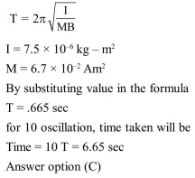 A magnetic needle of magnetic moment $6.7 \times 10^{-2} \mathrm{Am}^{2}$ and moment of inertia $7.5 \times 10^{-6} \mathrm{~kg} \mathrm{~m}^{2}$ is performing simple harmonic oscillations in a magnetic field of $0.01 \mathrm{~T}$. Time taken for 10 complete oscillations is :