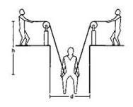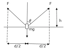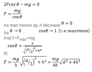 A man has fallen into a ditch of width $d$ and two of his friends are slowly pulling him out using a light rope and two fixed pulleys as shown in figure. Show that the force (assumed equal for both the friends) exerted by each friend on the road increases as the man moves up. Find the force when the man is at a depth $h$.