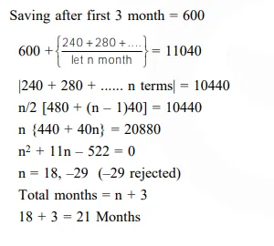 .A man saves Rs. 200 in each of the first three months of his service. In each of the subsequent months his saving increases by Rs. 40 more than the saving of immediately previous month. His total saving from the start of service will be Rs. 11040 after :-