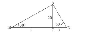 be the width of river. And the angles of depression on either side of the river are 30° and 60° respectively. It is given that AC = 20 m. Let BC = x and CD = y. And