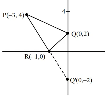 A man starts walking from the point $\mathrm{P}(-3,4)$, touches the $\mathrm{x}$-axis at $\mathrm{R}$, and then turns to reach at the point $Q(0,2)$. The man is walking at a constant speed. If the man reaches the point $Q$ in the minimum time, then $50\left((\mathrm{PR})^{2}+(\mathrm{RQ})^{2}\right)$ is equal to