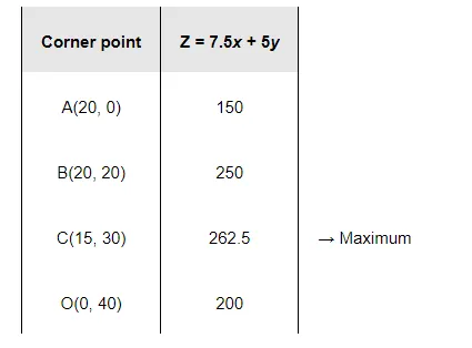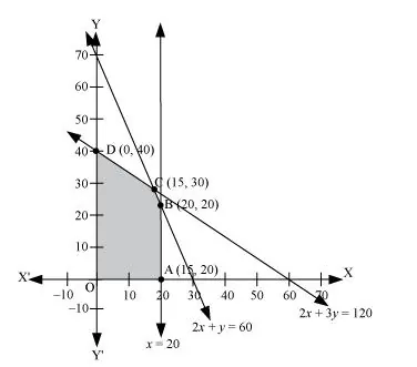 The corner points of the feasible region are A (20, 0), B (20, 20), C (15, 30), and D (0, 40).