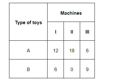 A manufacturer makes two types of toys A and B. Three machines are needed for this purpose and the time (in minutes) required for each toy on the machines is given below: